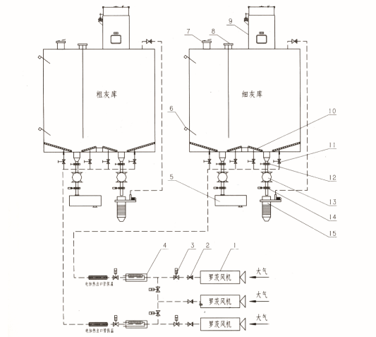 灰库系统由灰库本体、灰库气化系统、卸料系统、库顶系统、料位计等组成,主要设备有: