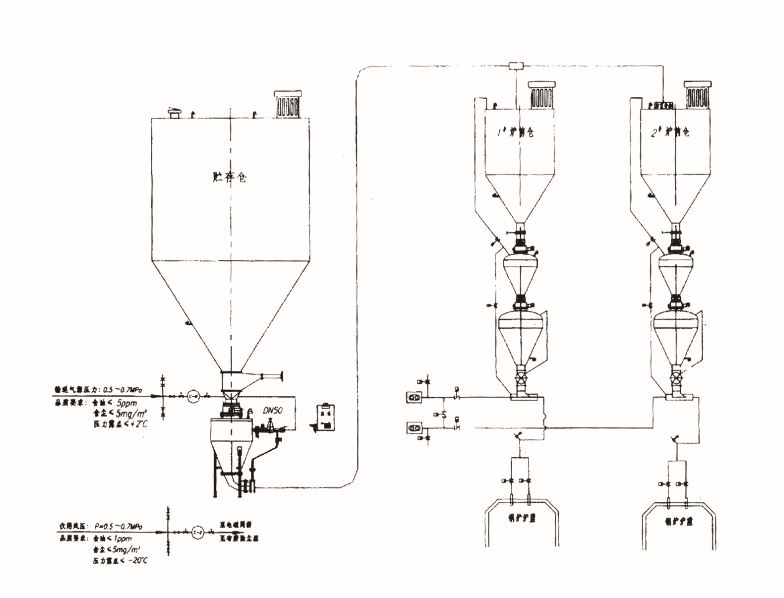 ★4、输送系统是以空压机作为动力源,采用高密度的低压栓流式输送,将物料从发送器以灰栓形式由管道输送至炉前仓。输送系统由发送器,进出料阀,补气阀,管路等组成。