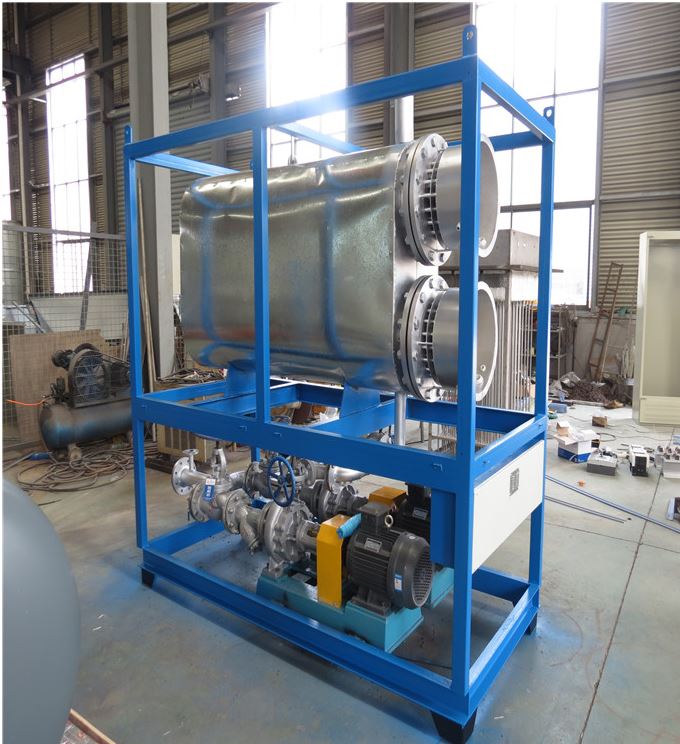 导热油循环系统撬装由2套电加热器上下串联组成,并配套两台防爆导热油泵和阀门管道系统。